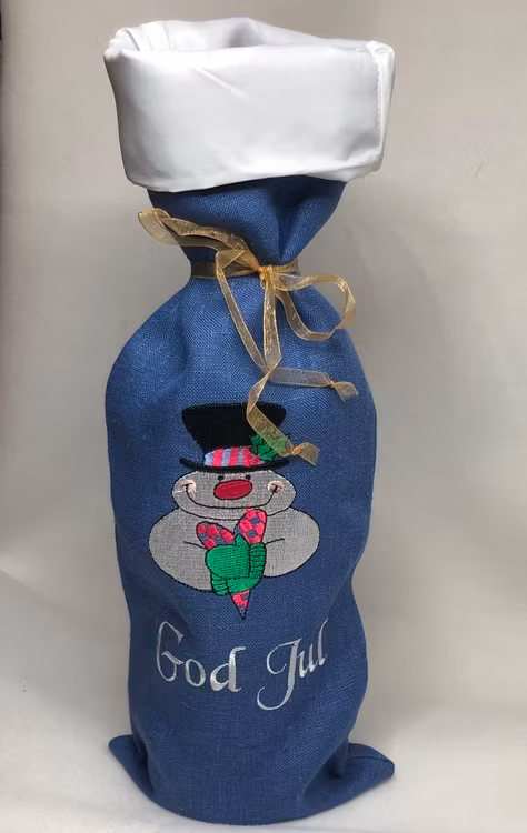 I lager. Blå påse med snögubbe 70 kr Lägg i korgen En perfekt presentpåse till flaskan. 45x15cmSydd i blått linnetyg, med vitt fodertyg Knytband ingår.