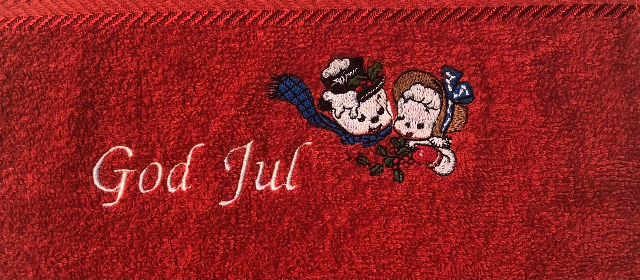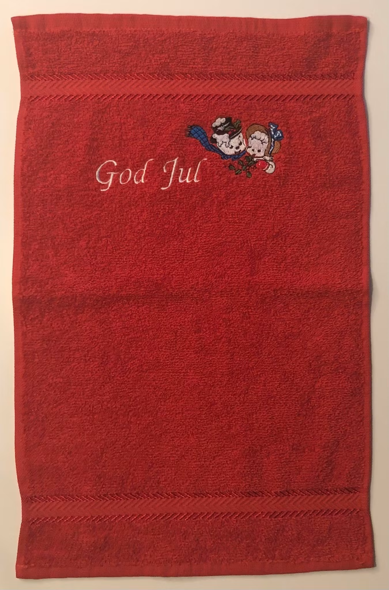 Snögubbe-par 75 kr Produkten är tyvärr slut i lager. Se gärna på andra likande produkter. En gästhandduk 30x50 cm.Tvättas i 60°Satin bård uppe o nere på frottén.