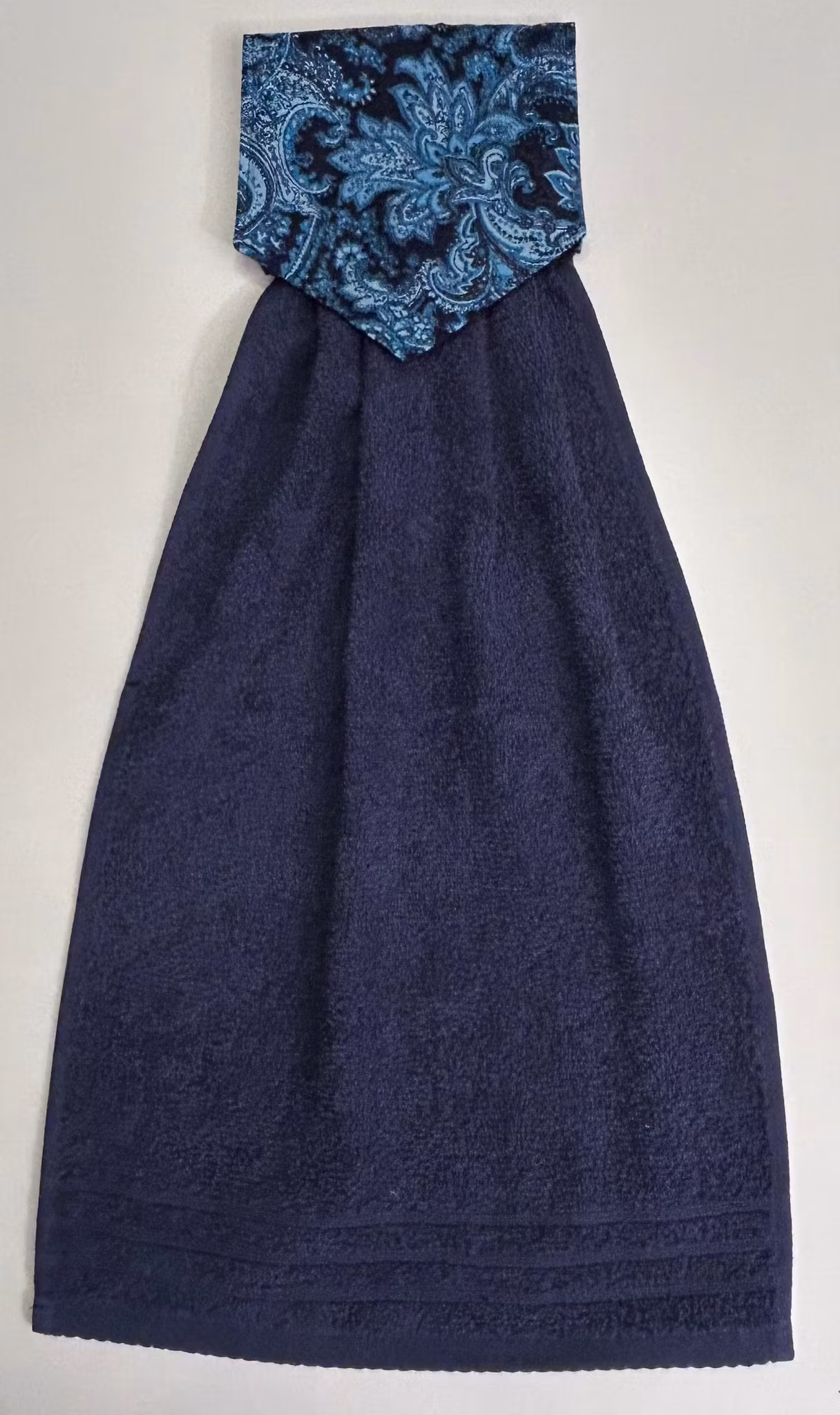 Blå mönstrad 80 kr Produkten är tyvärr slut i lager. Se gärna på andra likande produkter. En spishandduk att hänga t.ex. på ugnsluckan.Sydd av bomullstyg lätt vadderad för extra stadga, och knäpps med kardborrband.Frotten är ca 30x40 cm.Handduken kan tvättas i 60°