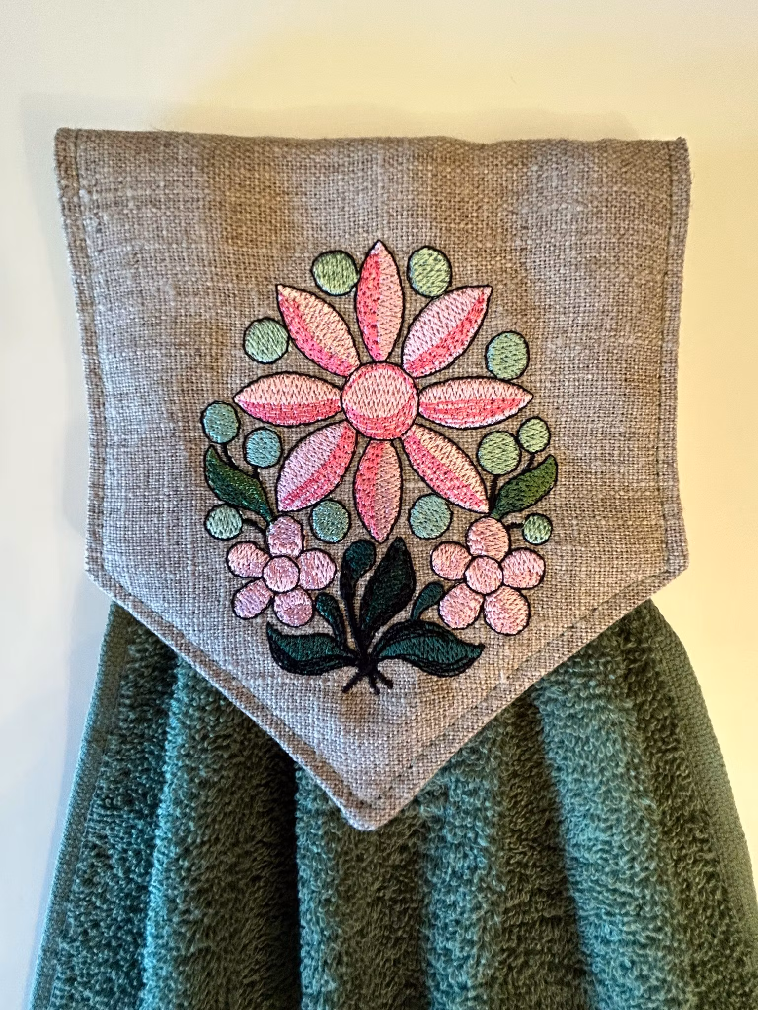 Spishandduk Rosa blomma 125 kr Produkten är tyvärr slut i lager. Se gärna på andra likande produkter. Spishandduk med kardborre-knäppning.Grön frotté ca 30x40cm med vävd bård nertill Tvättas i 60°
